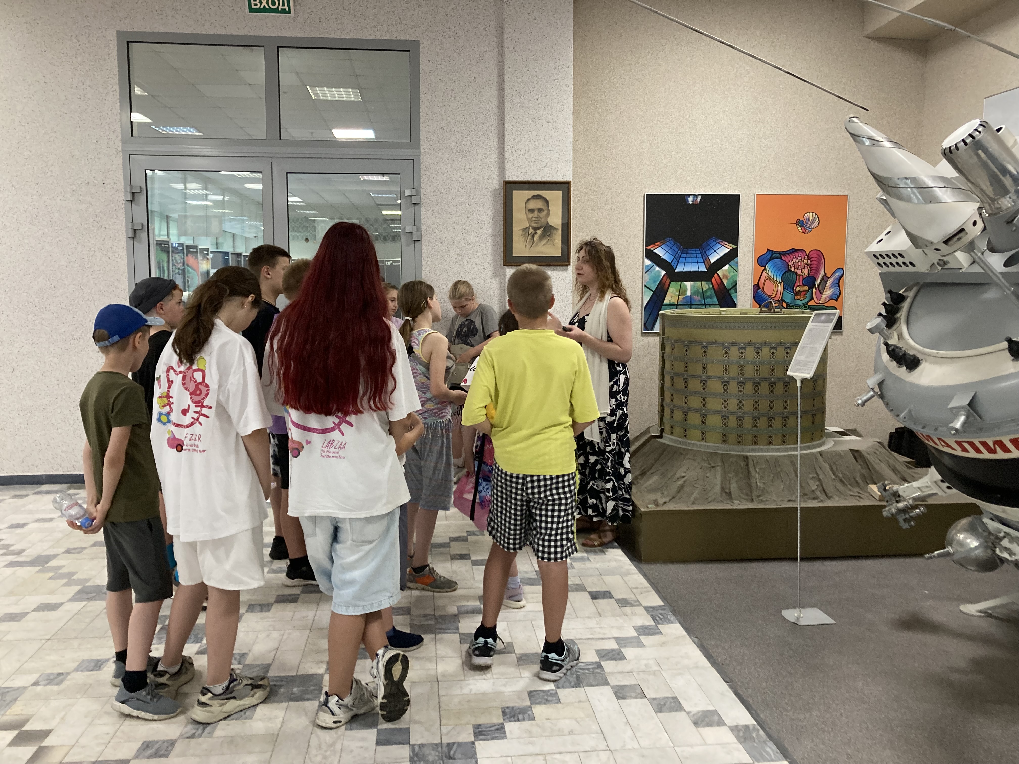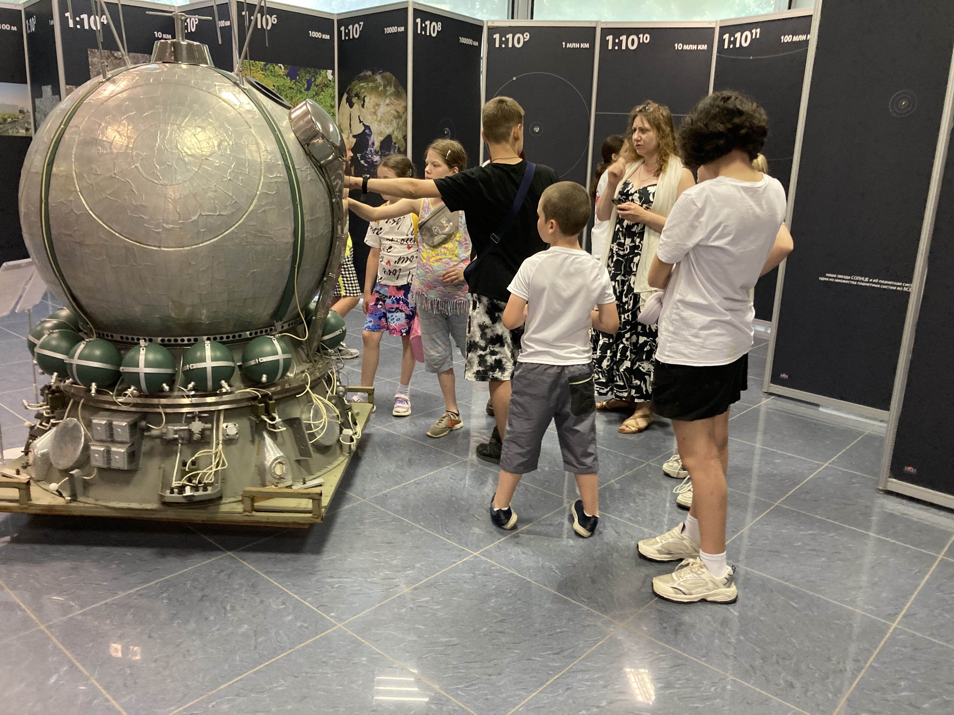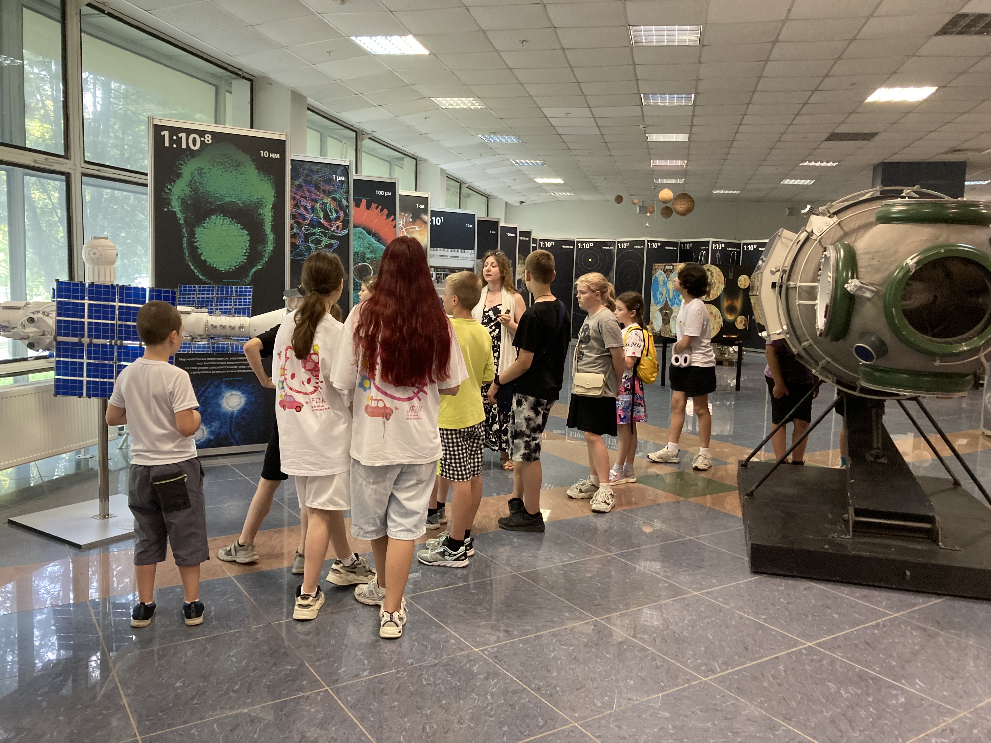 Детский лагерь "Атлант" на экскурсии в выставочном зале ИКИ РАН. Экскурсию проводит сотрудник Научно-образовательного центра Татьяна Жаркова.