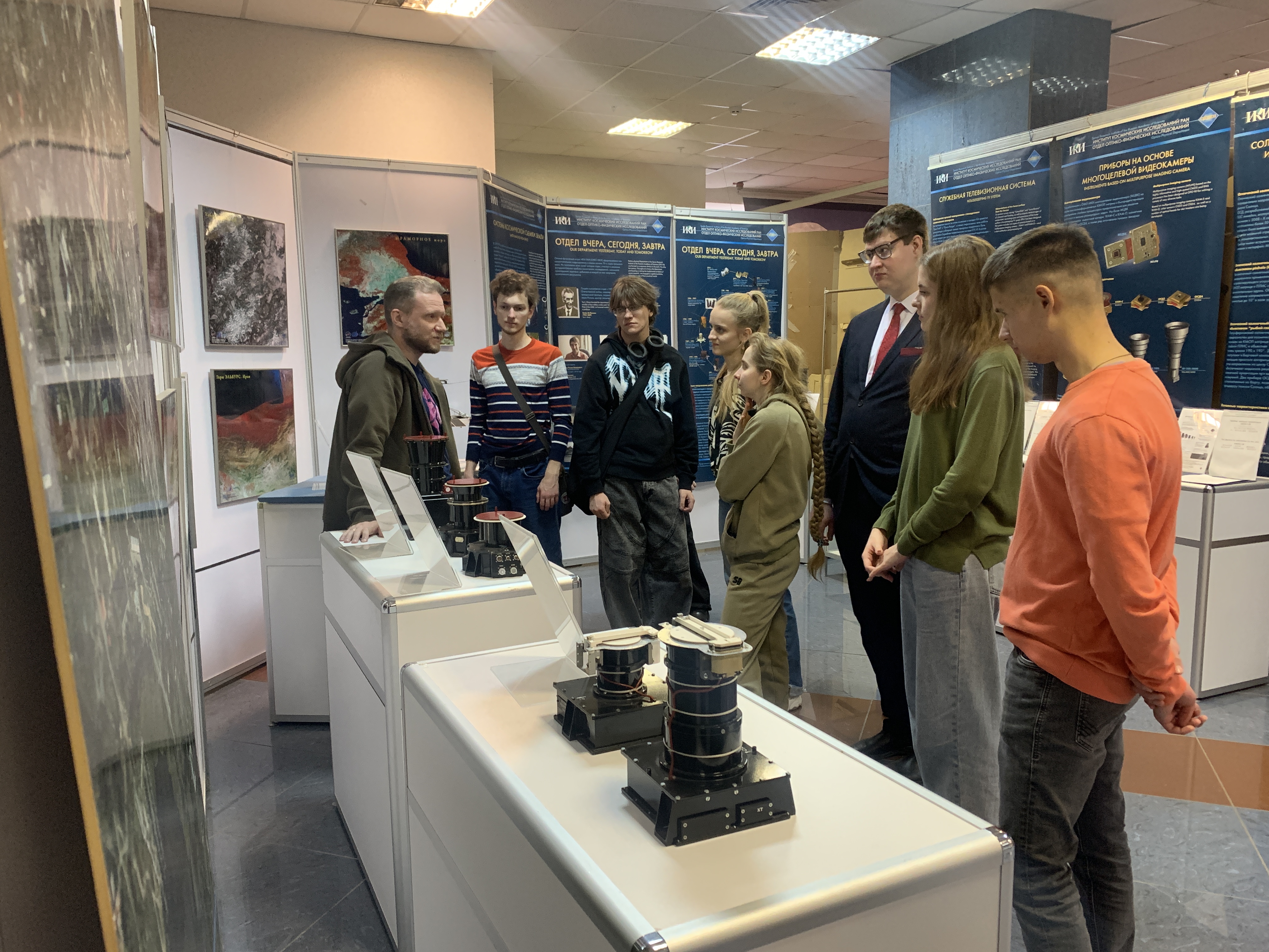 19 ноября 2025 г. студенты 4-го курса кафедры метеорологии и климатологии географического факультета МГУ имени М.В.Ломоносова на экскурсии в Выставочном центре ИКИ РАН, экскурсию проводит старший научный сотрудник Института Михаил Бурцев.