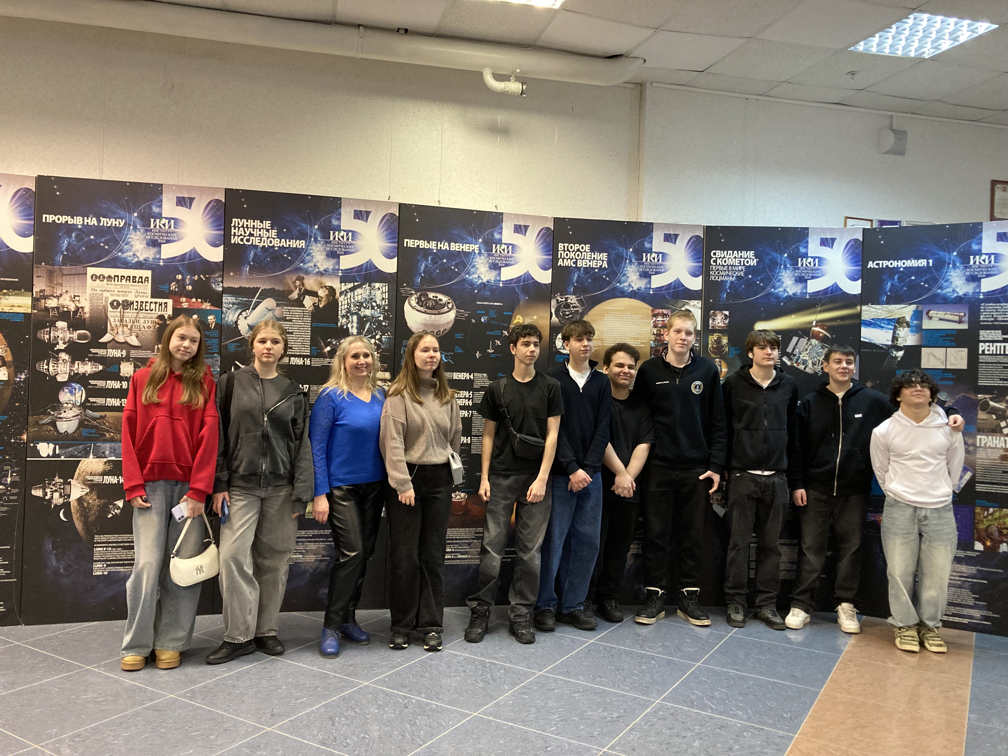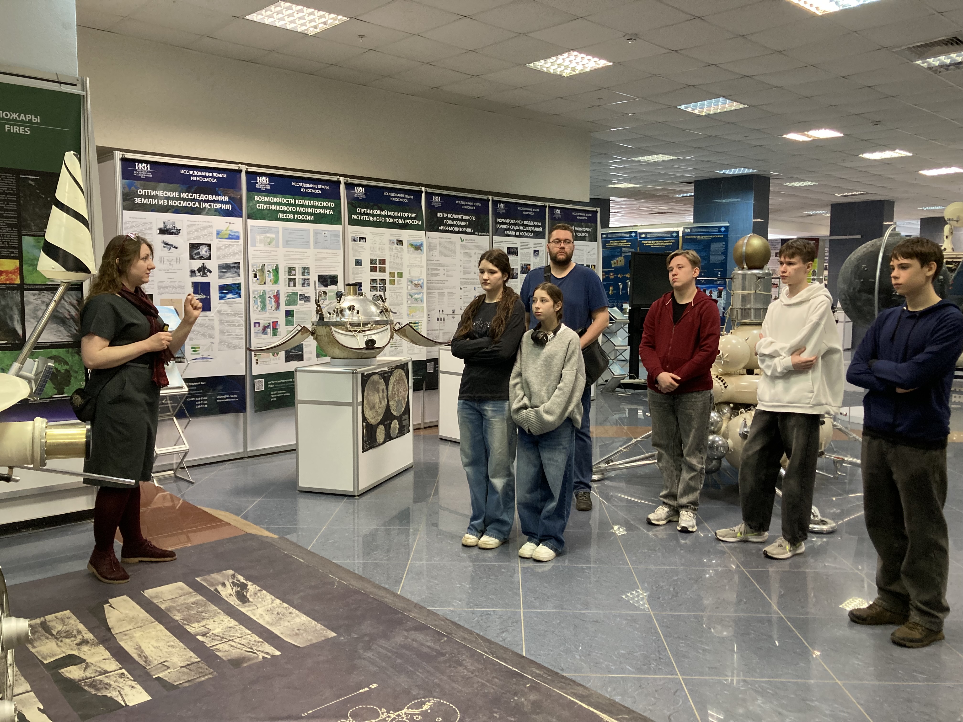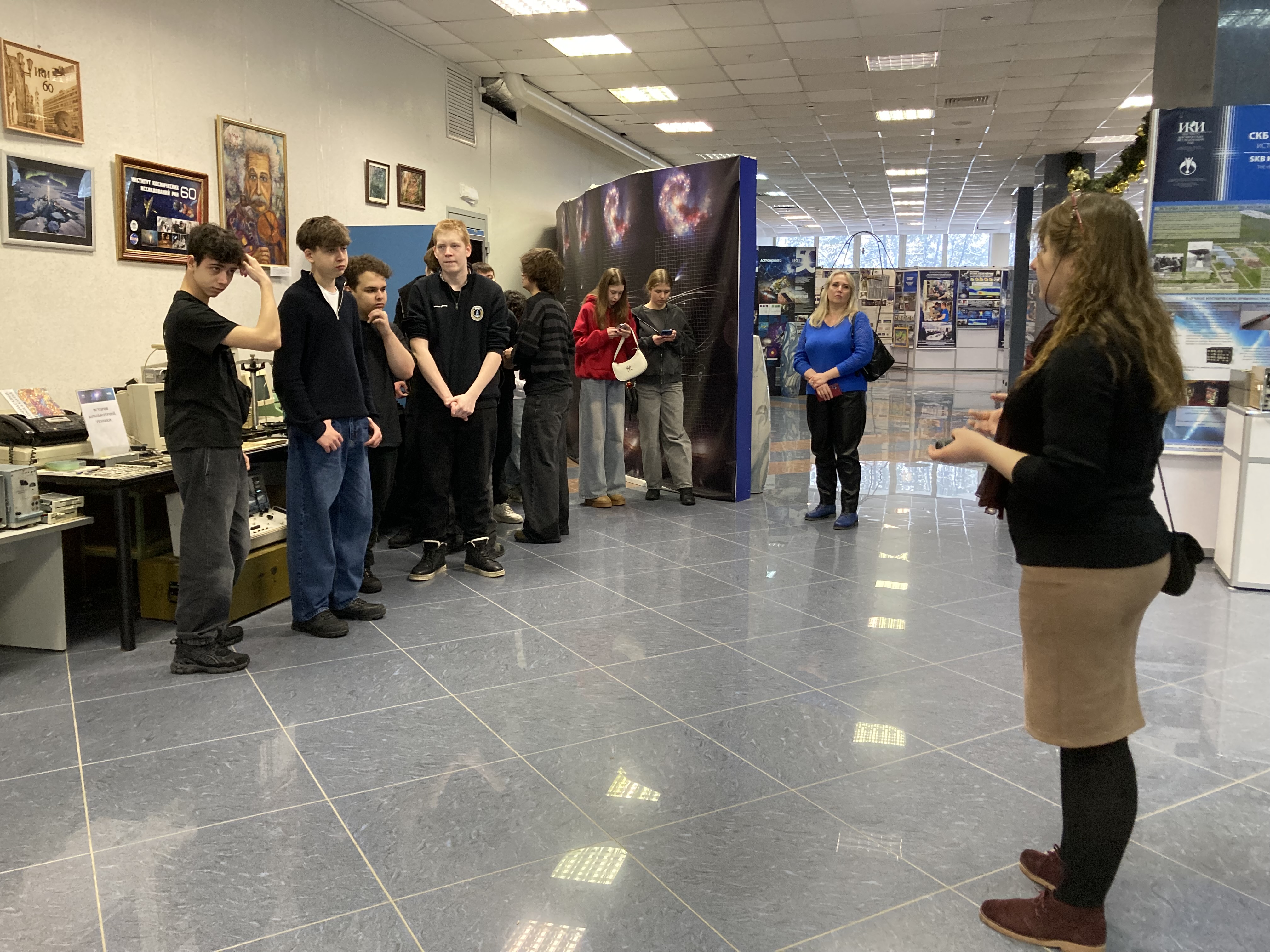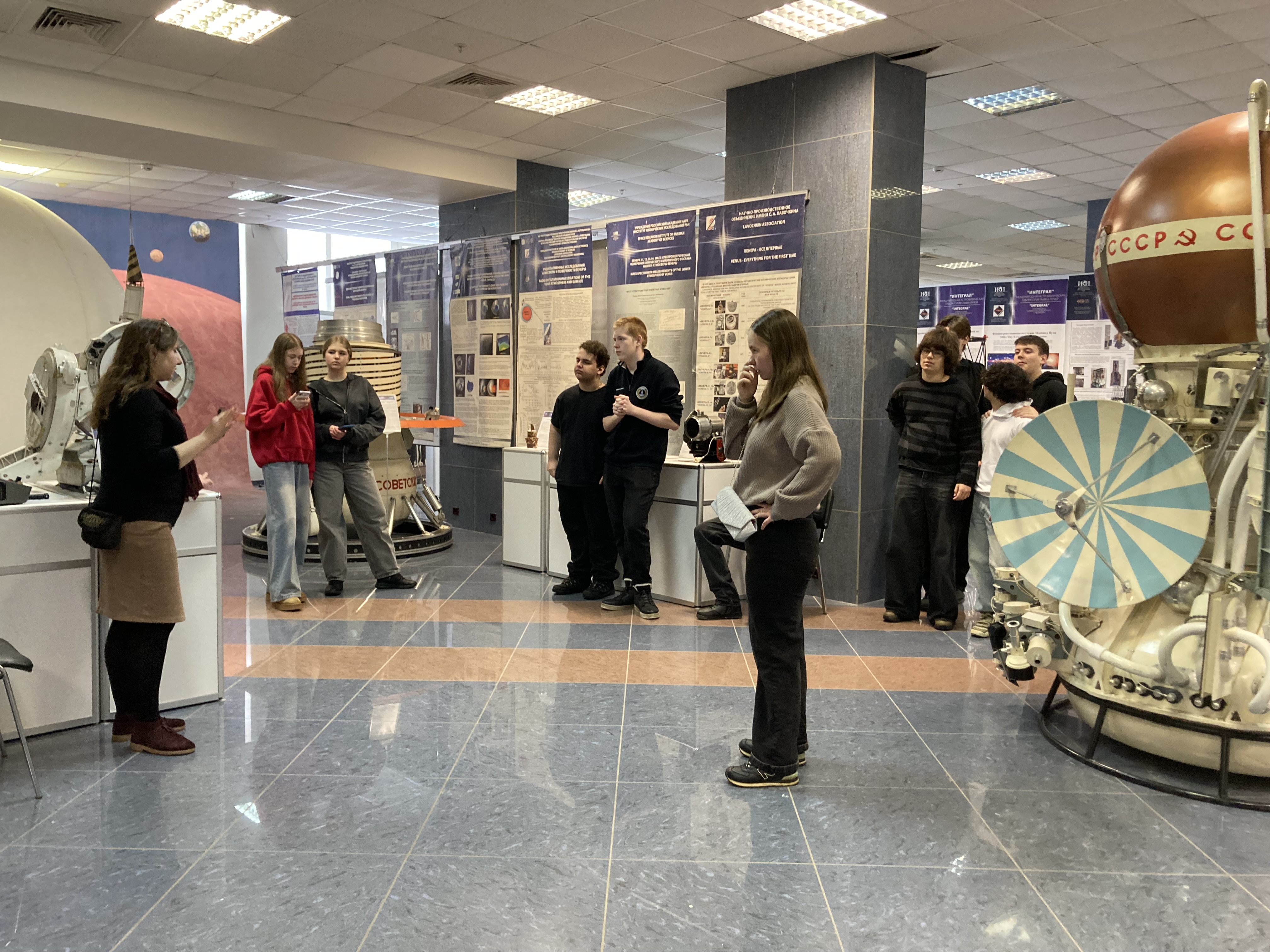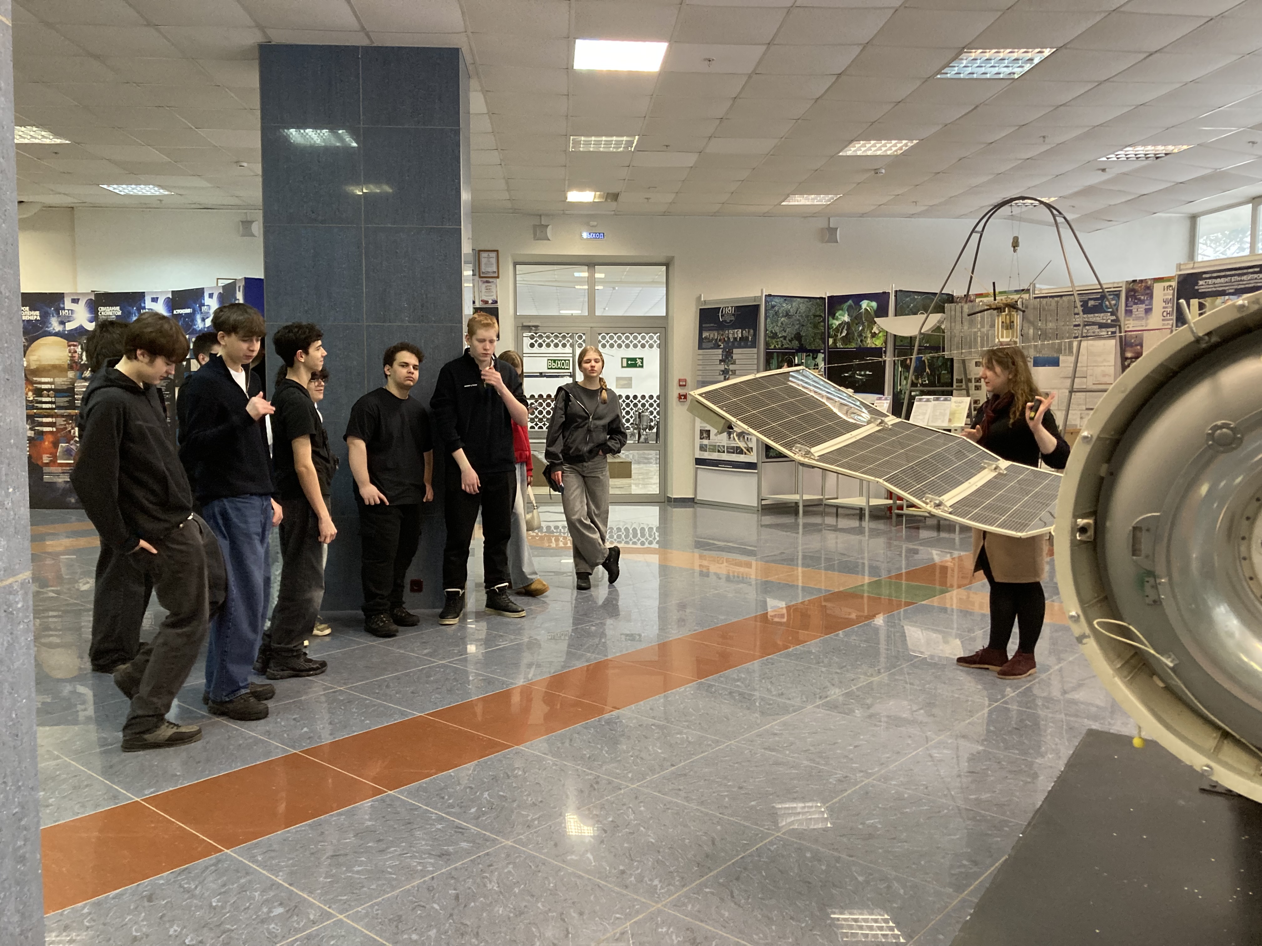 25 февраля,17 марта 2026г. Учащиеся Колледжа Царицыно, школы 630, 1158 на экскурсии в Выставочном зале ИКИ РАН. Экскурсию проводит сотрудник НОЦ ИКИ РАН Жаркова Татьяна.